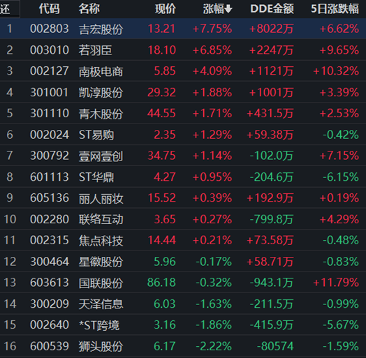 從領(lǐng)漲的互聯(lián)網(wǎng)電商行業(yè)看,截至6月8日11:30,行業(yè)的16只個(gè)股中,有2只漲幅超5%。