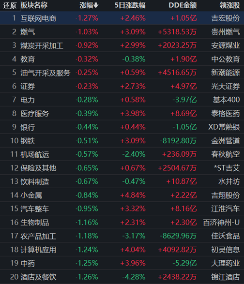 同花順行業(yè)方面,截至6月8日11:30,76類行業(yè)中有6類行業(yè)上漲,占比7.89%?;ヂ?lián)網(wǎng)電商行業(yè)居漲幅榜首,漲幅達(dá)1.27%,此外,燃?xì)庑袠I(yè)漲幅也超1%;跌幅居首的行業(yè)是房地產(chǎn)服務(wù),下跌3.29%,此外,其它電子和港口航運(yùn)跌幅也均超3%。