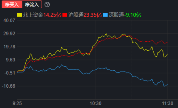 資金方面,北向資金早盤凈買入14.25億元,其中,滬股通凈買入23.35億元;深股通凈賣出9.10億元。