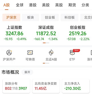 6月9日,A股三大指數(shù)上午集體下跌,創(chuàng)業(yè)板指數(shù)跌超2%。截至上午11:30,上證指數(shù)跌0.49%,報3247.86點;深證成指跌1.34%,報11872.52點,創(chuàng)業(yè)板指跌2.22%,報2519.26點;滬深兩市合計成交額6065.64億元;總體來看,A股市場個股跌多漲少,上漲個股為802只,下跌個股3907只。