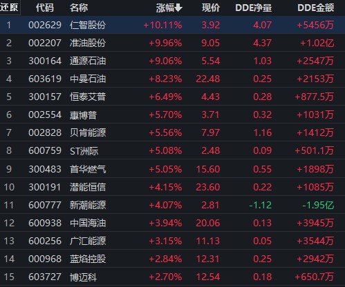 從領(lǐng)漲的油氣開采及服務(wù)行業(yè)看,截至6月9日11:30,行業(yè)的19只個股中,仁智股份、準(zhǔn)油股份、ST洲際等3只個股漲停,通源石油、中曼石油、恒泰艾普等3只個股漲幅均超6%。