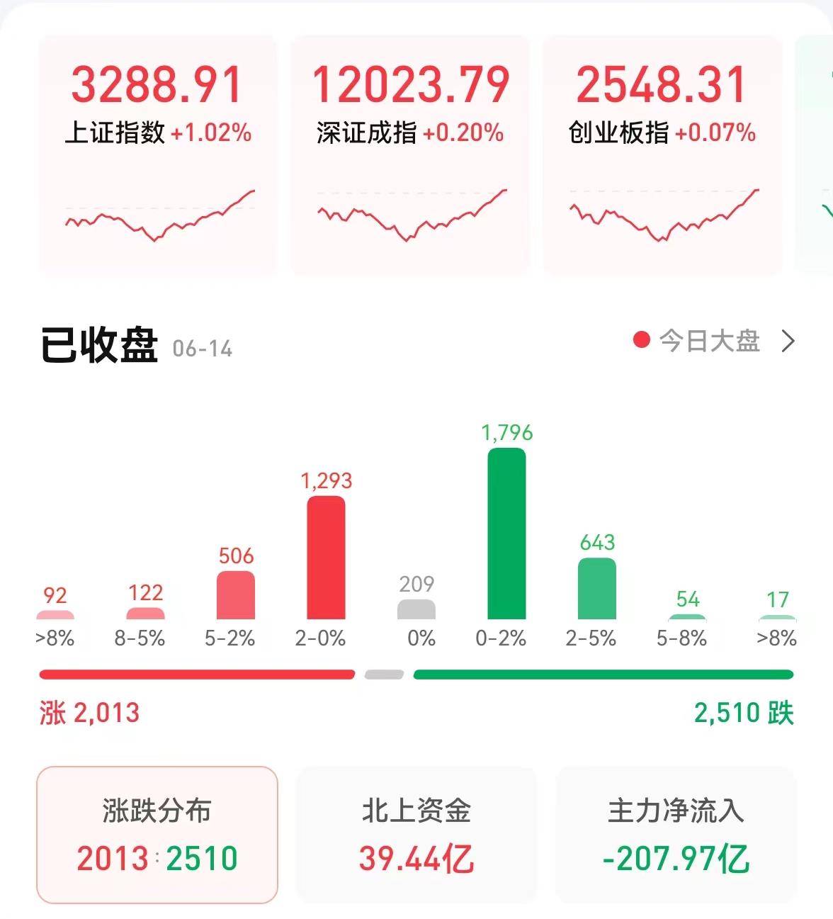 6月14日,三大股指低開(kāi)高走,全線飄紅,截至收盤(pán),上證指數(shù)漲1.02%報(bào)3288.91點(diǎn),深證成指漲0.2%報(bào)12023.79點(diǎn),創(chuàng)業(yè)板指漲0.07%報(bào)2548.31點(diǎn);兩市合計(jì)成交10994億元,連續(xù)第3個(gè)交易日突破萬(wàn)億元;北向資金凈買(mǎi)入39.44億元。總體來(lái)看,兩市個(gè)股跌多漲少。