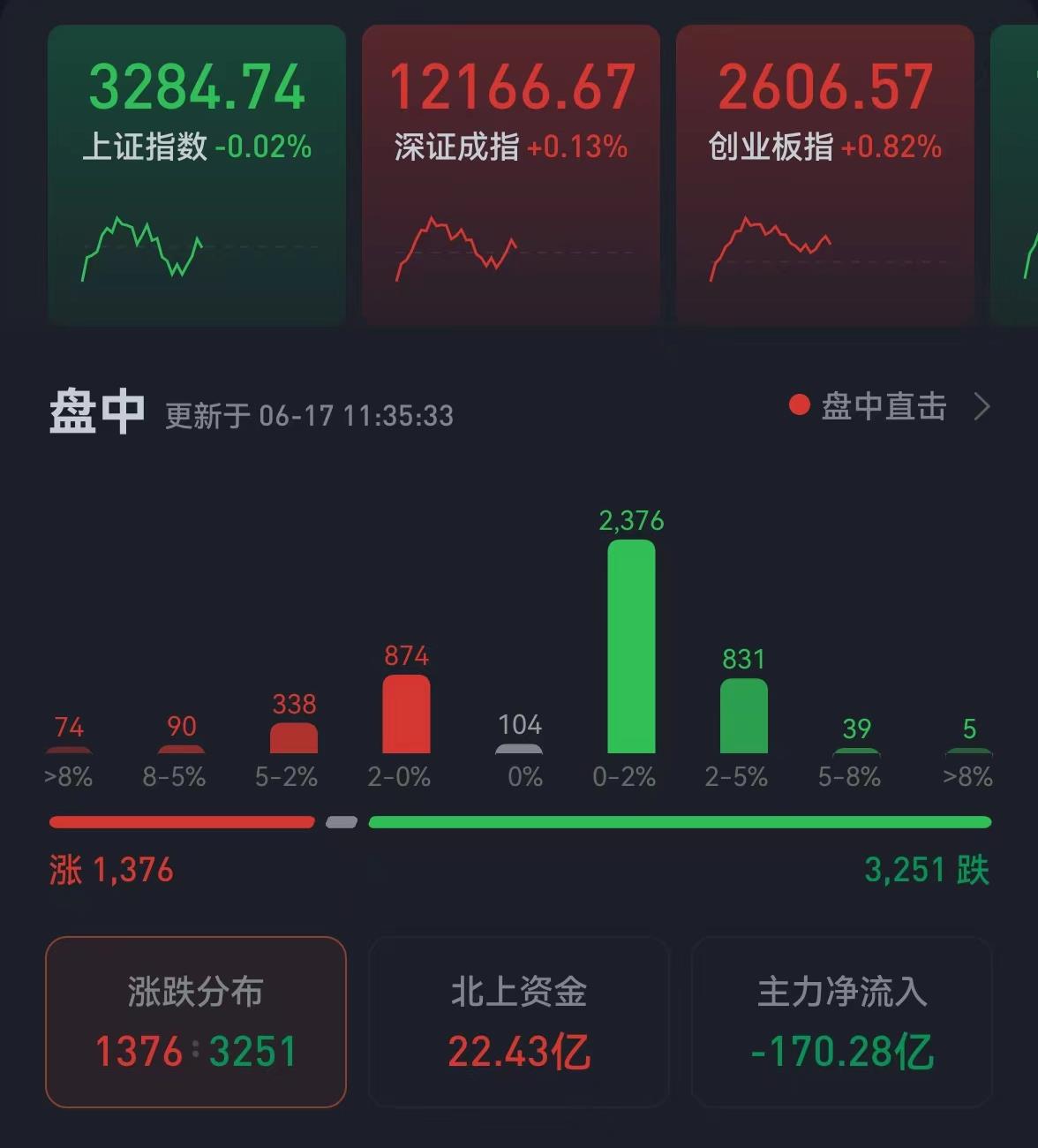 周四(6月16日)美股大幅收跌,道指跌2.42%,下破30000點關口,納指重挫4.08%,標普跌3.25%。6月17日,A股市場繼續(xù)走出獨立行情。三大股指震蕩分化。截至上午收盤,上證指數(shù)微跌0.02%,報3284.74點;深證成指和創(chuàng)業(yè)板指漲幅分別為0.13%和0.82%;滬深兩市合計成交額6572.8億元;總體來看,兩市個股跌多漲少。