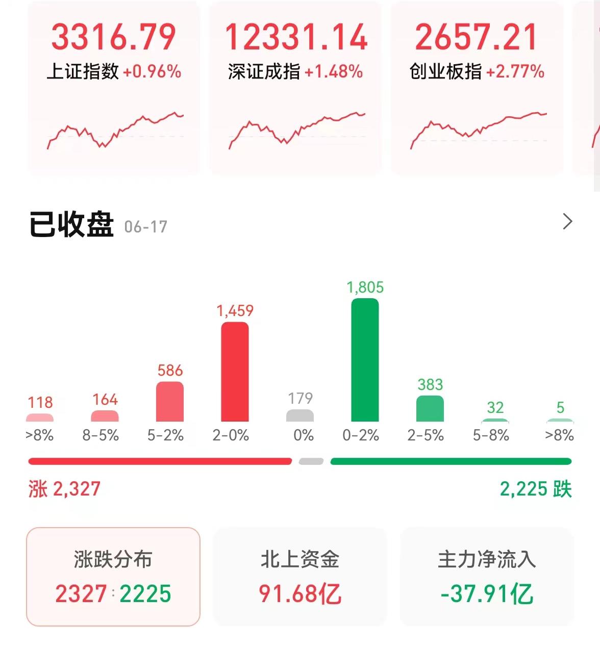 6月17日,三大股指低開(kāi)高走,集體收漲,截至收盤(pán),上證指數(shù)漲0.96%報(bào)3316.79點(diǎn),深證成指漲1.48%報(bào)12331.14點(diǎn),創(chuàng)業(yè)板指漲2.77%報(bào)2657.21點(diǎn);兩市合計(jì)成交10934億元,連續(xù)第6個(gè)交易日突破萬(wàn)億元;北向資金凈買(mǎi)入91.68億元。總體來(lái)看,A股個(gè)股漲多跌少。其中,有76只個(gè)股漲停。