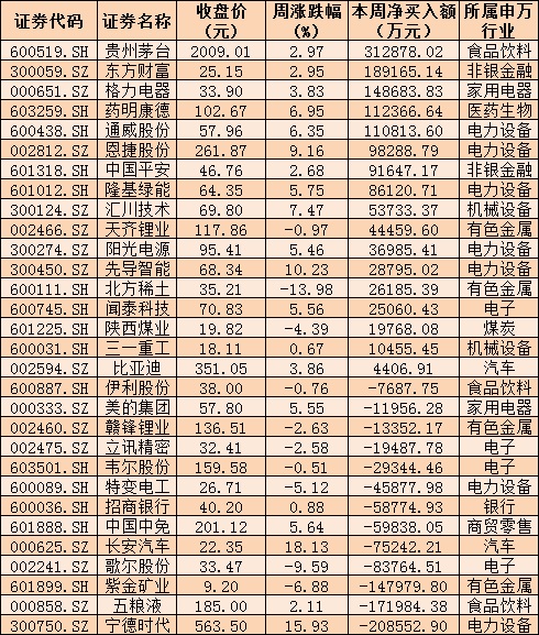 資金方面,北向資金本周累計(jì)凈買(mǎi)入金額達(dá)40.64億元,本月累計(jì)凈買(mǎi)入額達(dá)627.29億元。從前十大成交活躍股來(lái)看,本周,貴州茅臺(tái)、東方財(cái)富、格力電器、藥明康德、通威股份等5只個(gè)股,獲北向資金凈買(mǎi)入金額均超10億元。另外,寧德時(shí)代、五糧液、紫金礦業(yè)等個(gè)股遭北向資金凈賣出金額均超10億元。