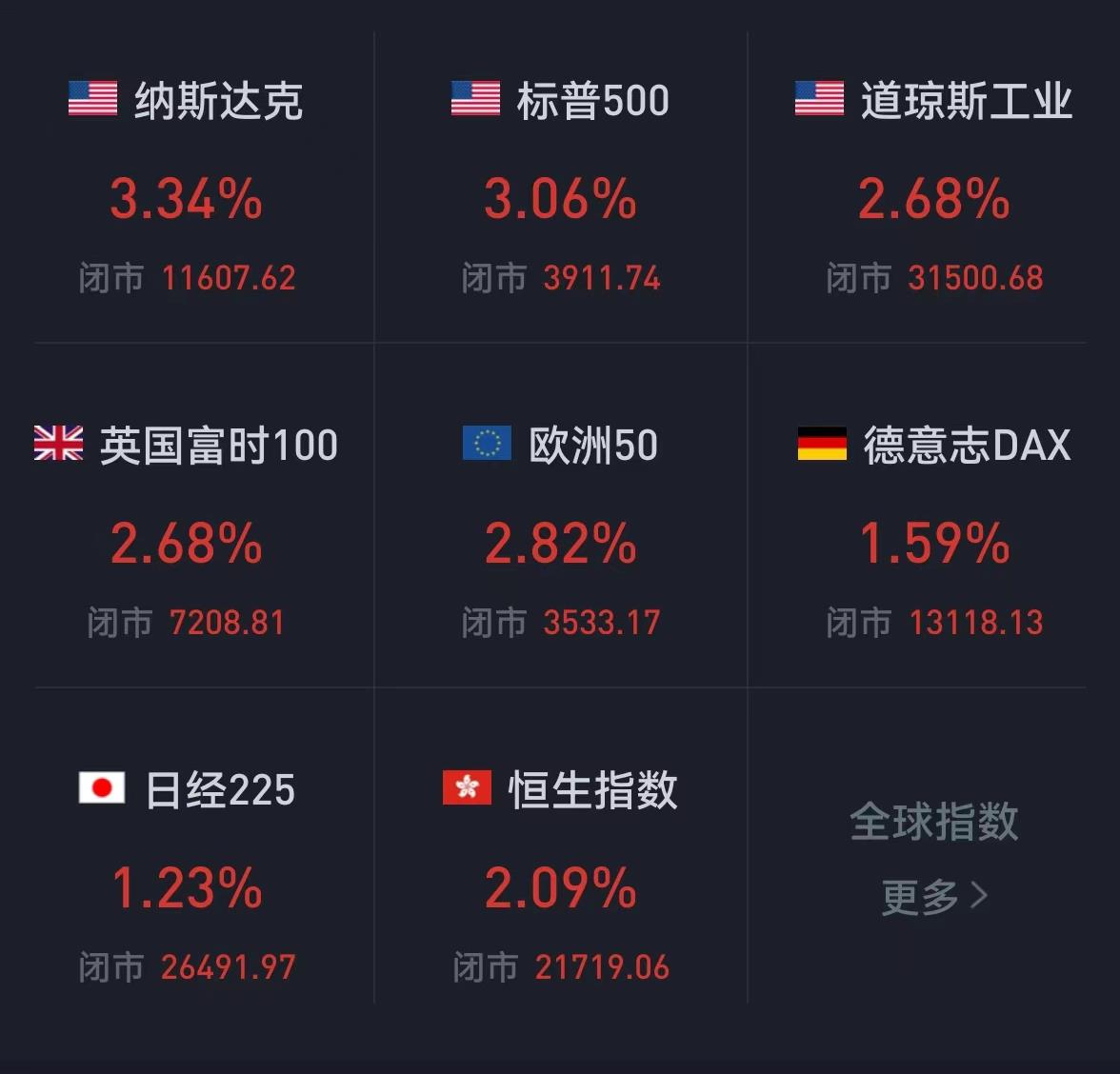 周五,美國(guó)三大股指全線收漲,道指漲2.68%報(bào)31500.68點(diǎn),標(biāo)普500指數(shù)漲3.06%報(bào)3911.74點(diǎn),納指漲3.34%報(bào)11607.62點(diǎn)。本周,道指漲5.39%,標(biāo)普500指數(shù)漲6.45%,納指漲7.49%。