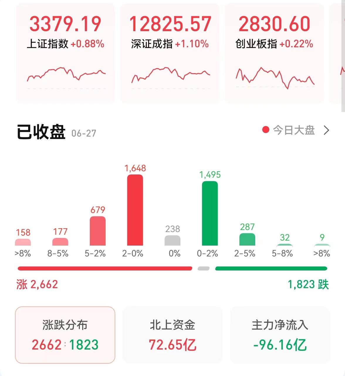 6月27日,A股三大指數(shù)集體收漲,截至收盤,上證指數(shù)漲0.88%報(bào)3379.19點(diǎn),深成指漲1.1%報(bào)12825.57點(diǎn),創(chuàng)業(yè)板指漲0.22%報(bào)2830.6點(diǎn);兩市合計(jì)成交12288億元,連續(xù)第3個交易日突破萬億元;北向資金凈買入72.65億元;總體來看,兩市個股漲多跌少,上漲個股為2662只,下跌個股1823只。