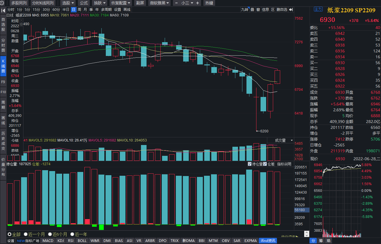 受現(xiàn)貨價格強勁支撐,紙漿期貨價格今日大幅上漲。同花順數(shù)據(jù)顯示,6月28日,上期所9月份交貨的紙漿期貨主力合約(紙漿2209合約)上漲5.64%,創(chuàng)6個多月以來,最大單日漲幅,收盤價為6930元/噸,在上期所各期貨品種中漲幅位居前列。且本周以來,該期貨主力合約已上漲7.71%。