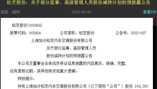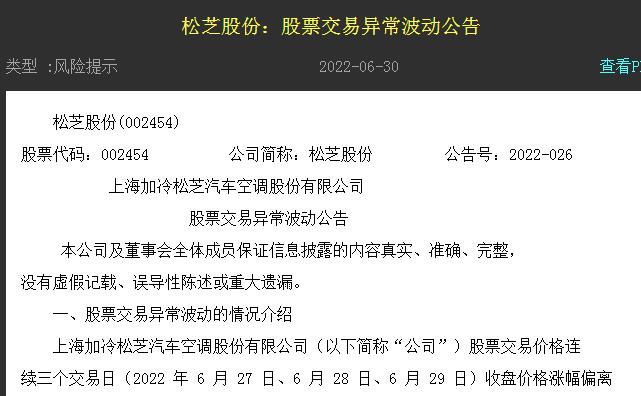 今日收盤后,松芝股份發(fā)布公告,公司股票交易價(jià)格連續(xù)三個(gè)交易日(2022年6月27日、6月28日、6月29日)收盤價(jià)格漲幅偏離值累計(jì)超過(guò)20%,根據(jù)《深圳證券交易所股票交易規(guī)則》的有關(guān)規(guī)定,屬于股票交易異常波動(dòng)的情況。