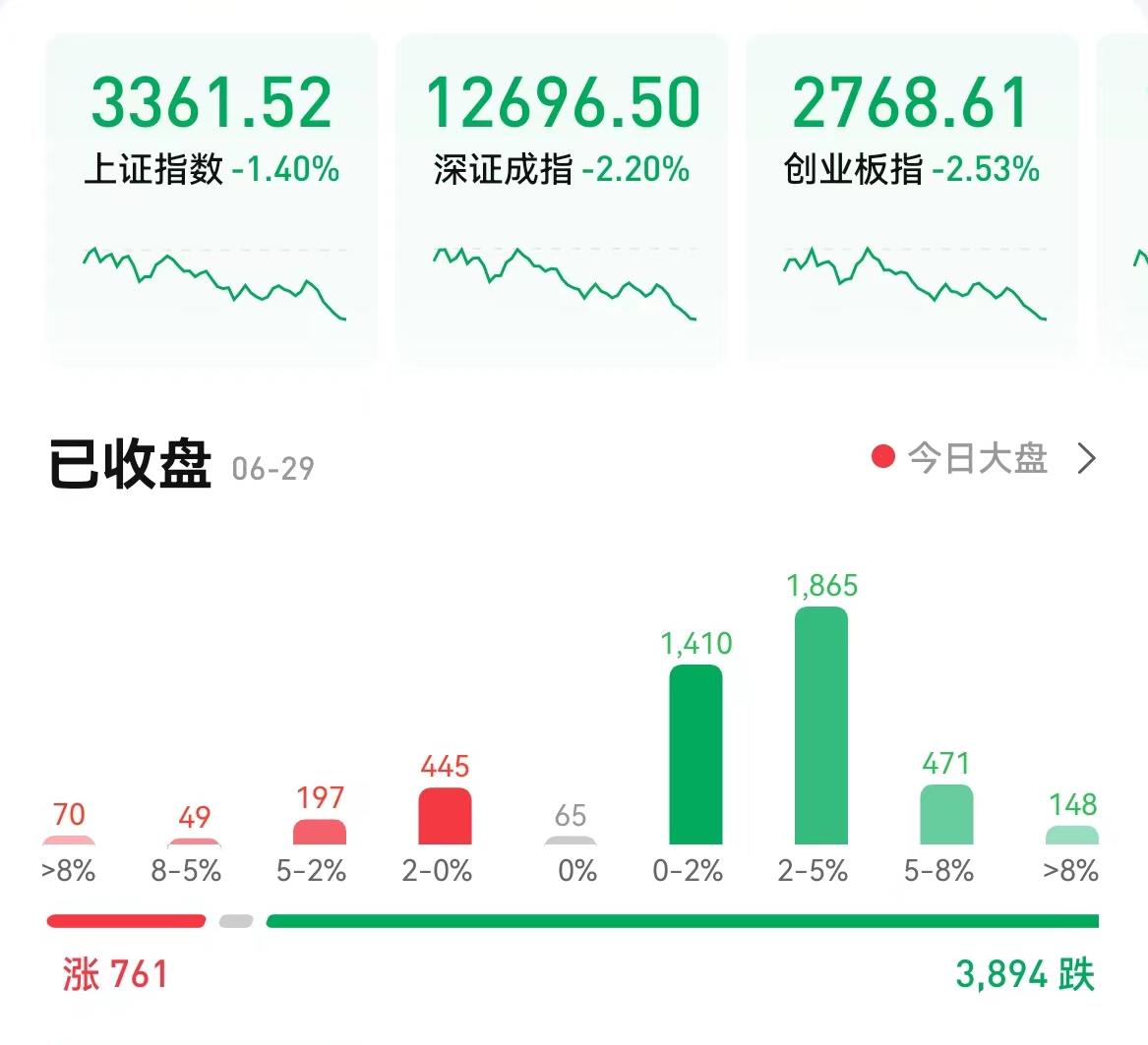 6月29日,三大股指震蕩回落,集體收跌,截至收盤,上證指數(shù)跌1.4%報(bào)3361.52點(diǎn),深證成指跌2.2%報(bào)12696.5點(diǎn);創(chuàng)業(yè)板指跌2.53%報(bào)2768.61點(diǎn);兩市合計(jì)成交13162億元,連續(xù)第5個(gè)交易日突破萬(wàn)億元;北向資金凈賣出16.83億元??傮w來(lái)看,兩市個(gè)股跌多漲少。