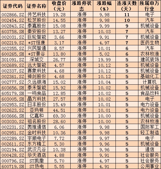 表:連續(xù)5日上漲且今日漲停股情況: