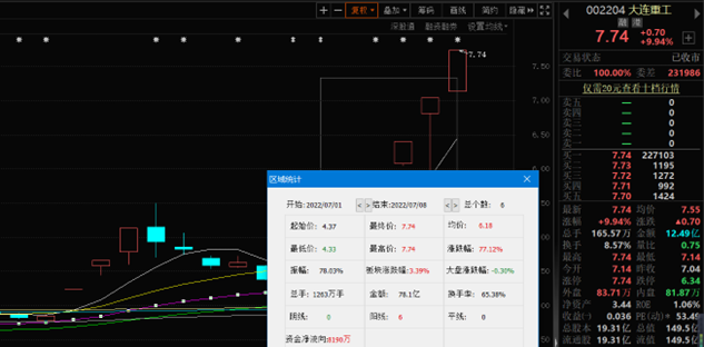 7月8日,大連重工再度漲停,報(bào)7.74元,自7月1日以來,截至7月8日已連續(xù)6個(gè)交易日以漲停板報(bào)收,累計(jì)漲幅達(dá)77.12%。
