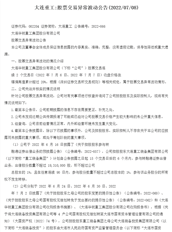 大連重工股票交易異常波動公告,其中關(guān)于公司認(rèn)為必要的風(fēng)險(xiǎn)提示2中,重述了6月18日披露的中報(bào)預(yù)告:“預(yù)計(jì)2022年半年度歸屬于上市公司股東的凈利潤為盈利15,000萬元-19,000萬元,比上年同期增長155.89%-224.13%。”
