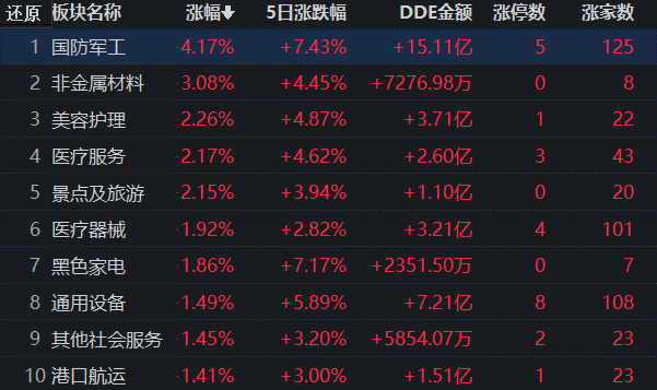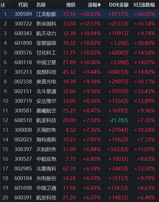 從漲幅居首的國防軍工行業(yè)看,截至7月20日11:30,行業(yè)交易中的126只個(gè)股,有125只上漲,其中,有5只個(gè)股漲停,有35只個(gè)股漲幅超5%。從資金流向看,國防軍工行業(yè)今天上午大單資金凈流入額達(dá)15.11億元,居各行業(yè)第1位。