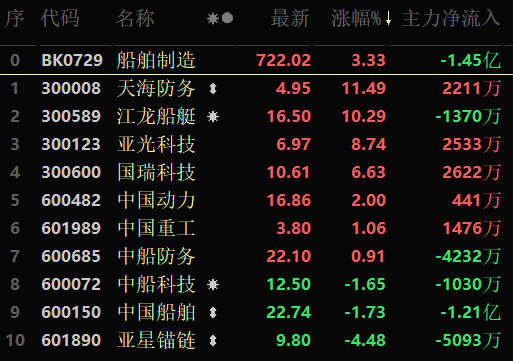 從漲幅居首的船舶制造行業(yè)看,截至8月2日11:30,行業(yè)交易中的10只個(gè)股,有7只上漲,其中,有4只個(gè)股漲幅超6%。從資金流向看,船舶制造行業(yè)今天上午大單資金凈流入額達(dá)-1.45億元。