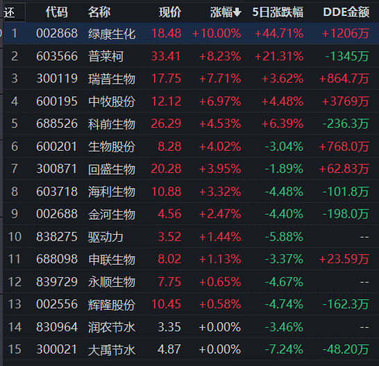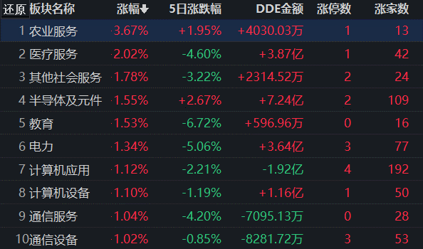 從漲幅居首的農(nóng)業(yè)服務(wù)行業(yè)看,截至8月4日上午收盤,行業(yè)交易中的15只個股,有13只上漲。從資金流向看,農(nóng)業(yè)服務(wù)行業(yè)今天上午大單資金凈流入額達4030.03萬元,居行業(yè)第13位。