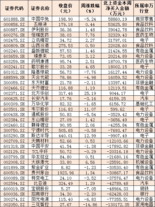 資金方面,北向資金本周累計(jì)凈賣出金額達(dá)12.33億元。從前十大成交活躍股來看,中國(guó)中免、五糧液、伊利股份、恒瑞醫(yī)藥、立訊精密等個(gè)股,北向資金凈買入金額均超3億元。另外,三花智控、陽(yáng)光電源、招商銀行、寶鋼股份、比亞迪等個(gè)股遭北向資金凈賣出金額均超4億元。