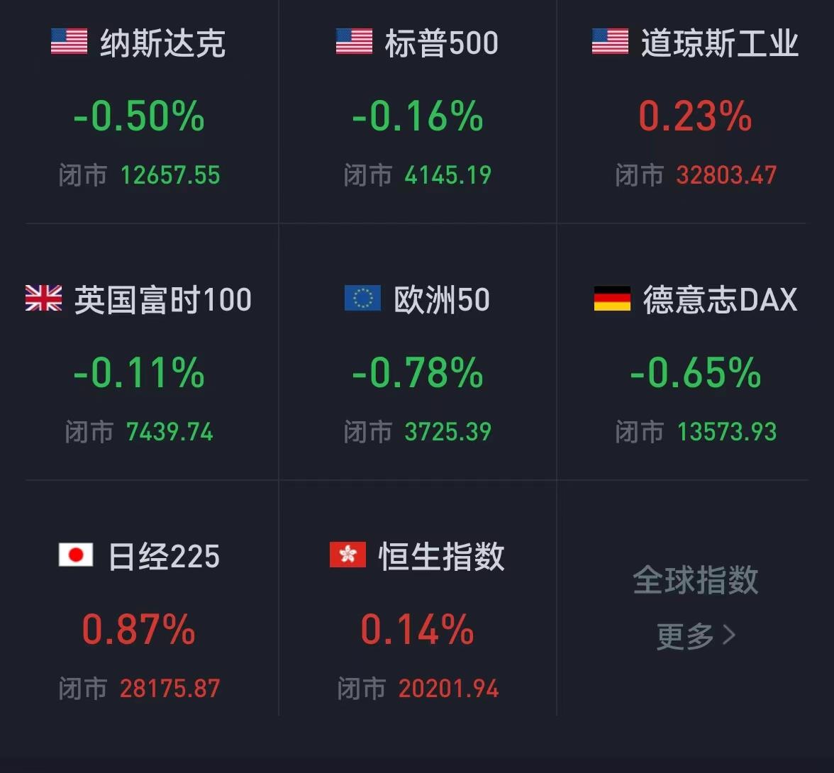 周五,美國(guó)三大股指收盤漲跌不一。道指漲幅達(dá)0.23%報(bào)32803.47點(diǎn),標(biāo)普500指數(shù)跌幅達(dá)0.16%報(bào)4145.19點(diǎn),納指跌幅達(dá)0.5%報(bào)12657.56點(diǎn)。本周,道指跌幅達(dá)0.13%,標(biāo)普500指數(shù)漲幅達(dá)0.36%,納指漲幅達(dá)2.15%。