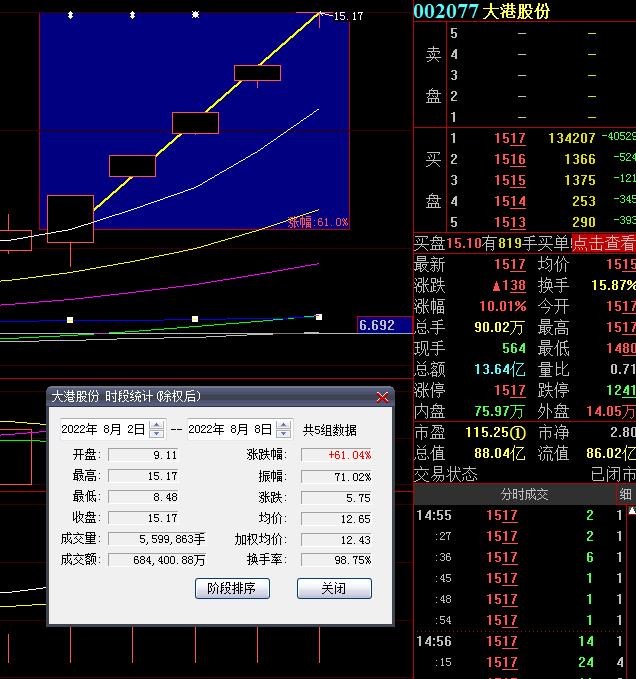 8月8日,熱門股大港股份再度漲停,截至收盤,報15.17元,實現(xiàn)5連板累計漲幅達61.04%。