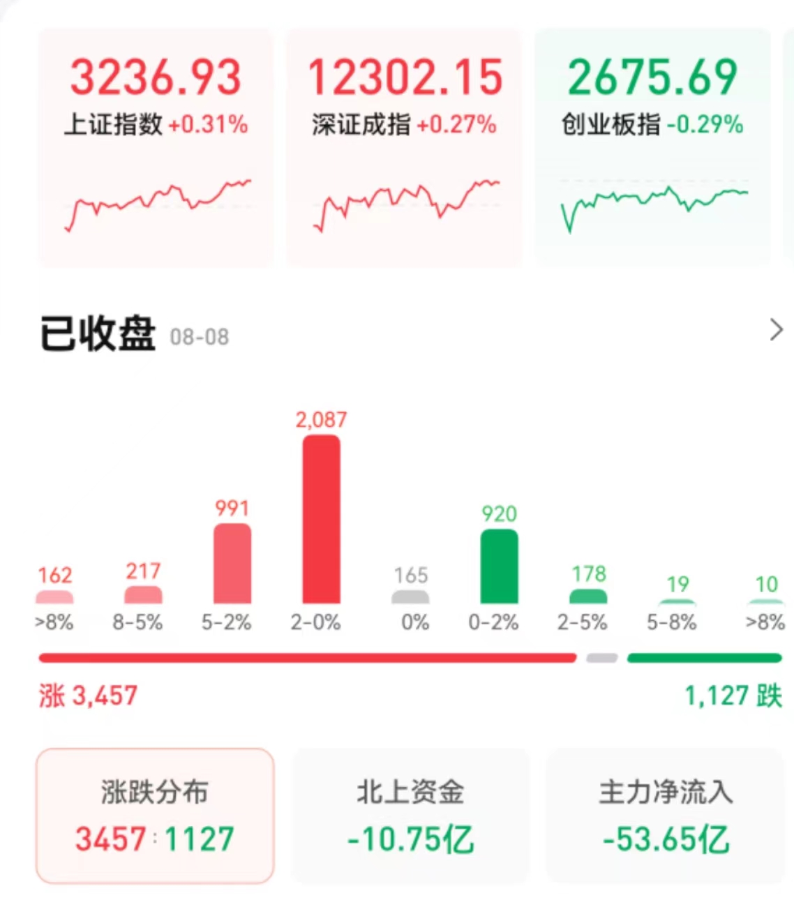 8月8日,三大股指漲跌不一,截至收盤,上證指數(shù)漲幅達0.31%報3236.93點,深證成指漲幅達0.27%報12302.15點,創(chuàng)業(yè)板指跌幅達0.29%報2675.69點;兩市合計成交9523億元,北向資金凈賣出10.75億元??傮w來看,A股個股漲多跌少。