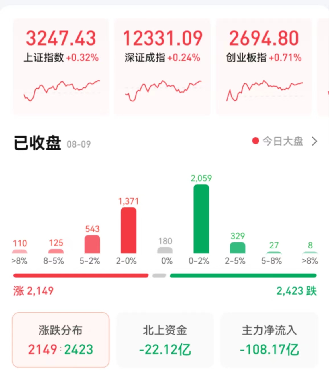 8月9日,三大股指全線飄紅,截至收盤,上證指數(shù)漲幅達(dá)0.32%報3247.43點,實現(xiàn)四連陽;深證成指漲幅達(dá)0.24%報12331.09點,創(chuàng)業(yè)板指漲幅達(dá)0.71%報2694.8點;兩市合計成交9530億元,北向資金凈賣出22.12億元??傮w來看,A股個股跌多漲少。