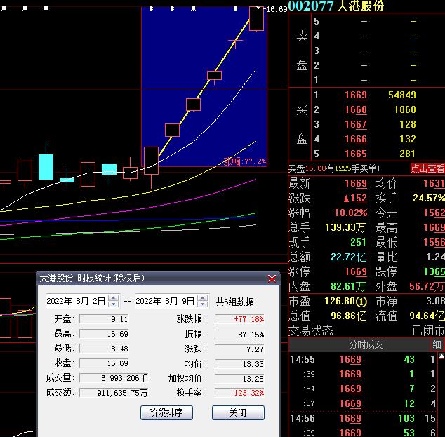 8月9日,熱門芯片股大港股份再度漲停,截至收盤,報16.69元,實現(xiàn)6連板累計漲幅達(dá)77.18%。