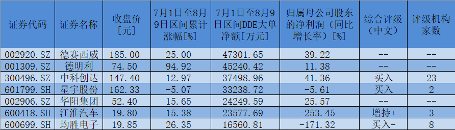表:7月1日至8月9日,無(wú)人駕駛概念板塊期間累計(jì)獲大單資金凈流入額超億元個(gè)股一覽