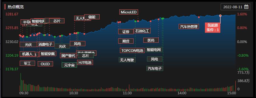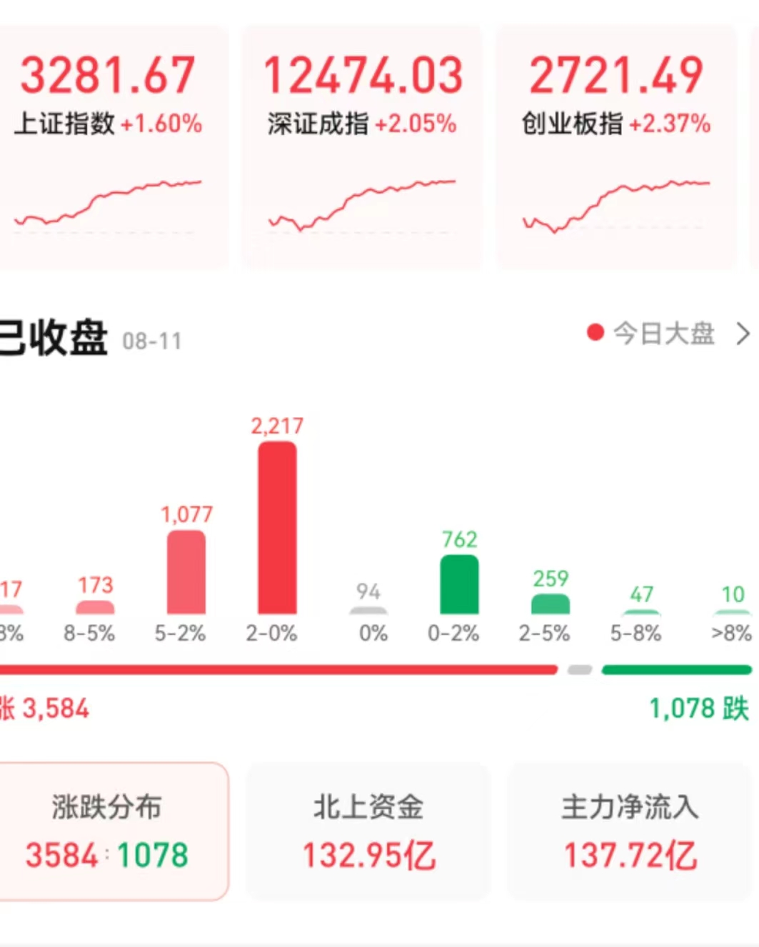 8月11日,三大股指全線飄紅,截至收盤,上證指數(shù)漲幅達漲1.6%報3281.67點,深證成指漲幅達2.05%報12474.03點,創(chuàng)業(yè)板指漲幅達2.37%報2721.49點;兩市合計成交10667億元??傮w來看,A股個股漲多跌少。