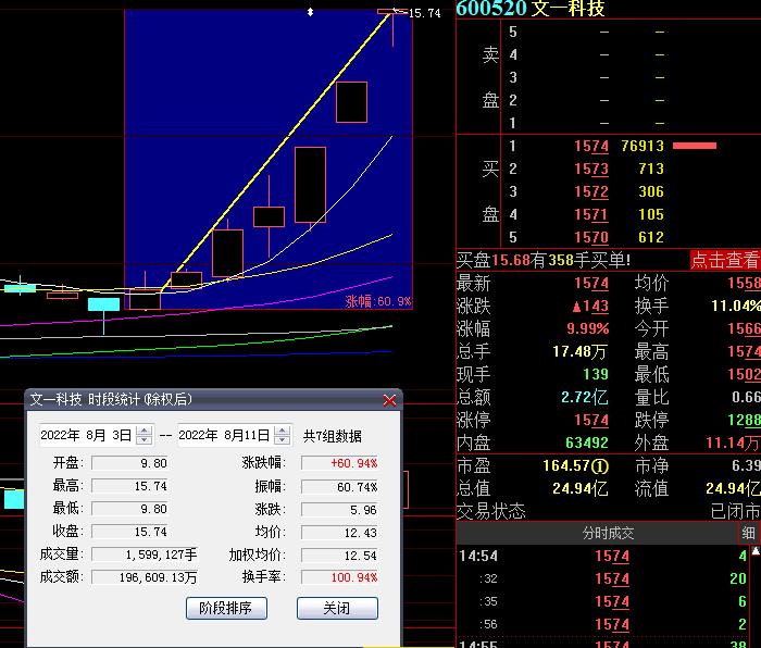 8月11日,熱門股文一科技再度漲停,截至收盤,報15.74元,走出3連板,實現(xiàn)7連漲,7日累計漲幅達60.94%。
