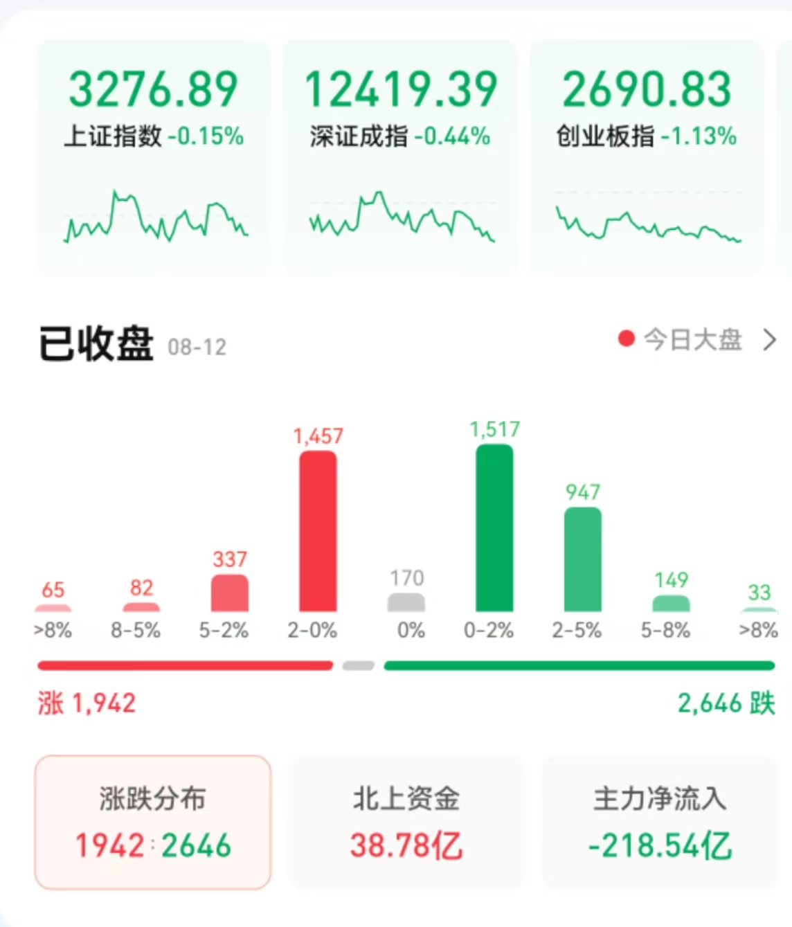 8月12日,三大股指集體收跌,截至收盤,上證指數(shù)跌幅達(dá)0.15%報(bào)3276.89點(diǎn),深證成指跌幅達(dá)0.44%報(bào)12419.39點(diǎn),創(chuàng)業(yè)板指跌幅達(dá)1.13%報(bào)2690.83點(diǎn);兩市合計(jì)成交額9995億元,北向資金凈買入38.78億元??傮w來看,A股個(gè)股跌多漲少。