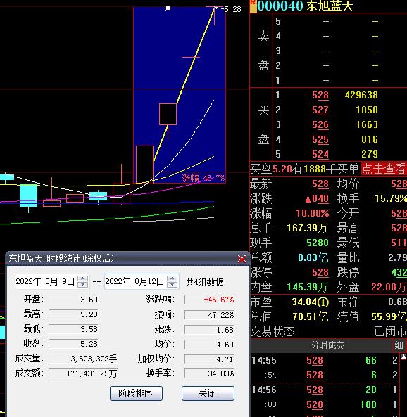 8月12日,熱門股東旭藍(lán)天再度漲停,截至收盤,報(bào)5.28元,實(shí)現(xiàn)4連板累計(jì)漲幅達(dá)46.67%。