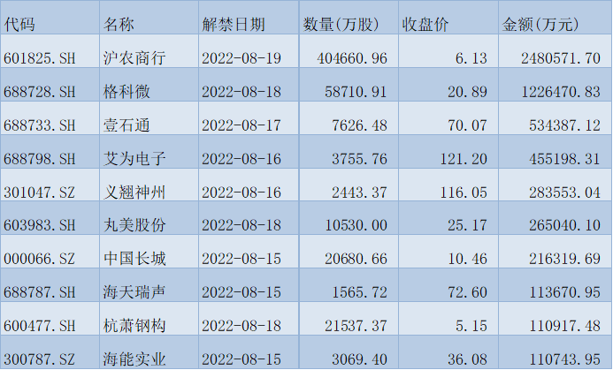 表:下周解禁金額前十位(本周收盤價計算)