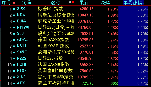本周全球主要指數表現強勢。周五,美股三大指數集體收漲,道指漲1.27%,本周累計上漲2.92%;標普500指數漲1.73%,本周累計上漲3.26%,納斯達克指數漲2.09%,本周累計上漲3.08%。