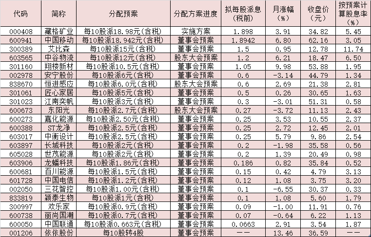 從單家公司來看,上述23家公司中,有8家公司擬每股派現(xiàn)金額均在0.5元及以上,藏格礦業(yè)擬每股派現(xiàn)金額居首,達(dá)到1.898元,中國移動(dòng)緊隨其后,擬每股派現(xiàn)金額也達(dá)1.8942元,艾比森、中谷物流、翔樓新材擬每股派現(xiàn)金額分別達(dá)到1.5元、1.2元、1.05元。