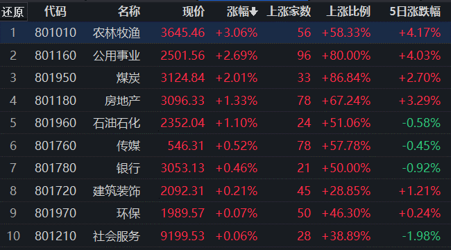 從申萬一級行業(yè)看,31類行業(yè)中有10類上漲,占比32.26%,其中,農(nóng)林牧漁行業(yè)漲幅居前,為3.06%;跌幅最大的是電力設(shè)備,跌幅為2.80%。
