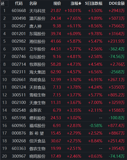 8月19日,申萬一級行業(yè)中農(nóng)林牧漁領(lǐng)漲,漲幅達(dá)3.06%。95只交易中的個股,有56只上漲,其中,有1只個股漲停,6只個股漲幅超5%。