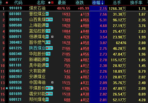 具體看,截至上午收盤,煤炭石油板塊走強,漲幅居首,達(dá)2.15%。其中,晉控煤業(yè)、山西焦煤、上海能源等個股漲幅居前均超4%。