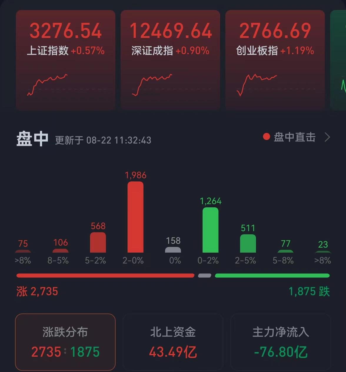 周一(8月22日),三大股指震蕩反彈,全線飄紅。截至上午收盤,上證指數(shù)漲幅達(dá)0.57%,報3276.54點;深證成指和創(chuàng)業(yè)板指漲幅分別為0.90%和1.19%;滬深兩市合計成交額6658億元,總體來看,兩市個股漲多跌少。
