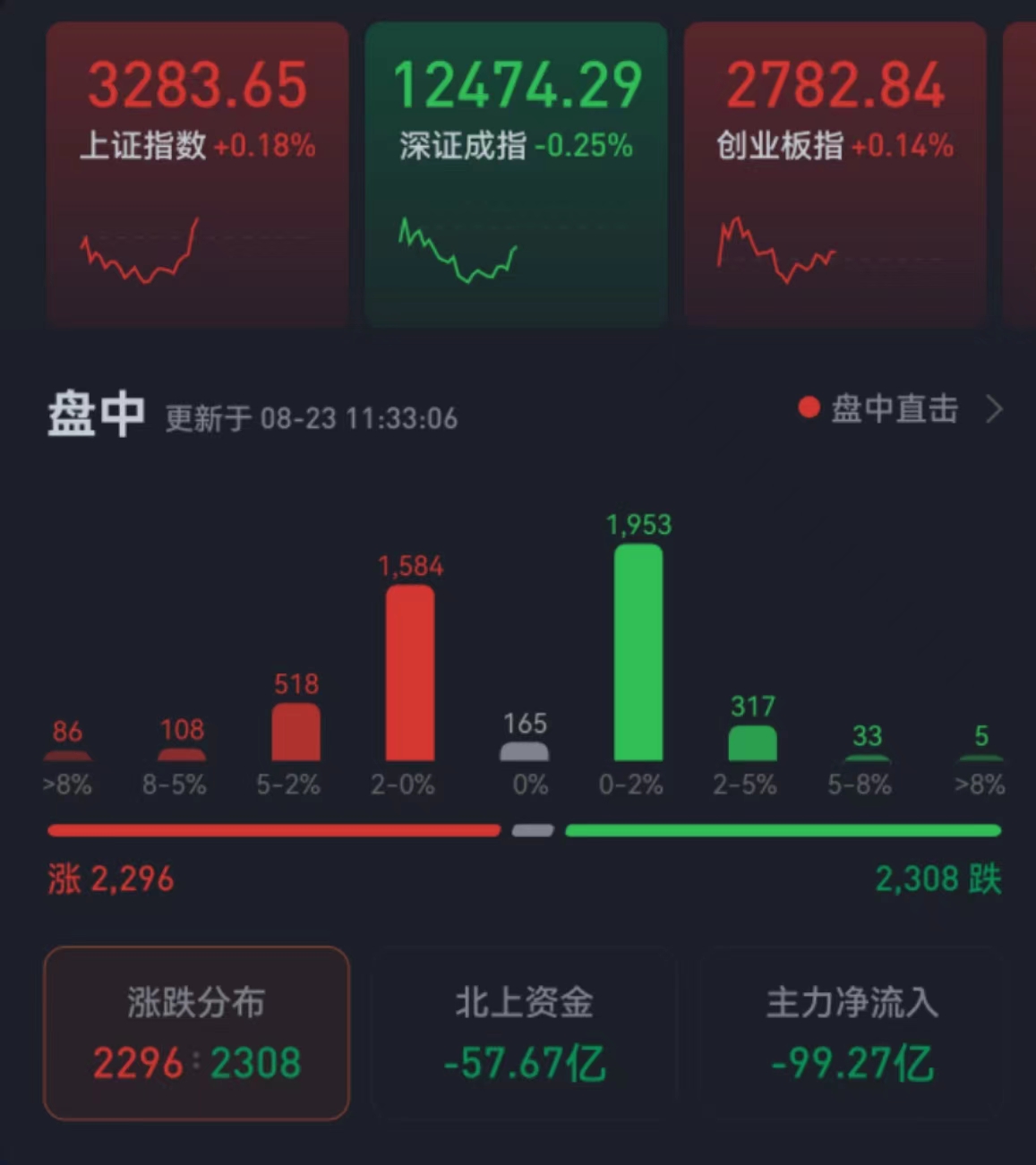 周二(8月23日),三大股指震蕩分化,漲跌不一。截至上午收盤(pán),上證指數(shù)漲幅達(dá)0.18%,報(bào)3283.65點(diǎn);深證成指跌幅為0.25%,創(chuàng)業(yè)板指漲幅為0.14%;滬深兩市合計(jì)成交額6295.3億元。