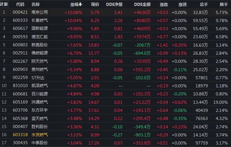 具體看,截至8月23日上午收盤(pán),燃?xì)獍鍓K漲幅居前,達(dá)4.39%,其中,南京公用、長(zhǎng)春燃?xì)狻⒌慢垍R能、新潮能源等4只概念股均報(bào)收于漲停。
