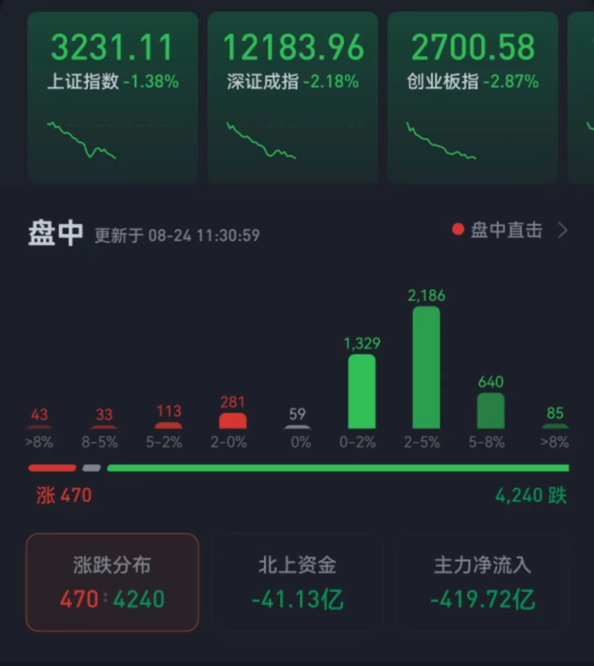 周三(8月24日),三大股指震蕩回落。截至上午收盤,三大股指跌幅均逾1%,上證指數(shù)跌幅達1.38%,報3231.11點;深證成指和創(chuàng)業(yè)板指跌幅分別為2.18%和2.87%;滬深兩市合計成交額7384.7億元,總體來看,兩市個股跌多漲少,逾4000只個股下跌。