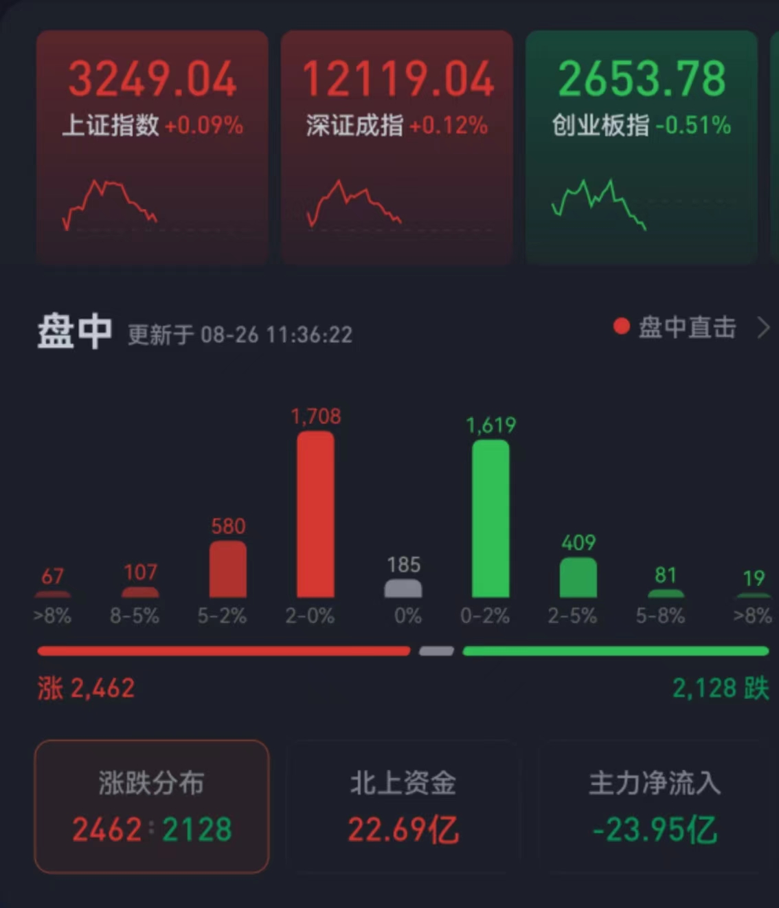周五(8月26日),三大股指震蕩分化,漲跌不一。截至上午收盤,上證指數(shù)漲幅為0.09%,報(bào)3249.04點(diǎn);深證成指漲幅為0.12%,創(chuàng)業(yè)板指微跌0.51%;滬深兩市合計(jì)成交額5889.2億元,總體來(lái)看,兩市個(gè)股漲多跌少。