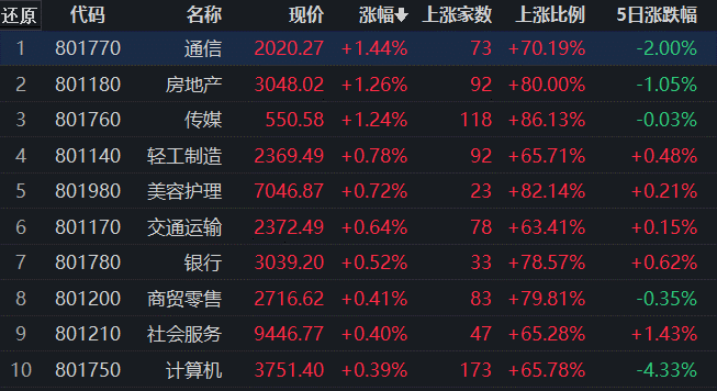 從申萬一級(jí)行業(yè)看,31類行業(yè)中有12類上漲,占比38.71%,其中,通信行業(yè)漲幅居前,為1.44%,此外,房地產(chǎn)和傳媒漲幅也均超1%;跌幅最大的是煤炭,跌幅為5.10%。