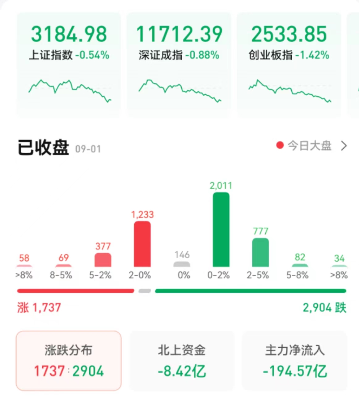 9月1日,三大股指全線收跌,截至收盤,上證指數(shù)跌0.54%報3184.98點,深證成指跌0.88%報11712.39點,創(chuàng)業(yè)板指跌1.42%報2533.85點,走出七連跌的走勢;兩市合計成交7948億元,北向資金凈賣出8.42億元??傮w來看,A股個股跌多漲少。