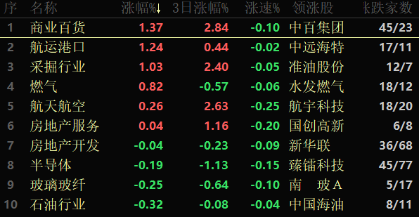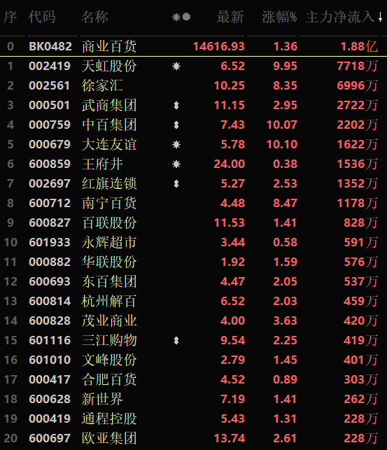 從漲幅居首的商業(yè)百貨看,截至9月14日11:30,行業(yè)交易中的70只個(gè)股有45只上漲,其中6只漲幅超5%。從資金流向看,該行業(yè)今天上午大單資金凈流入額達(dá)1.88億元,居行業(yè)第2位。