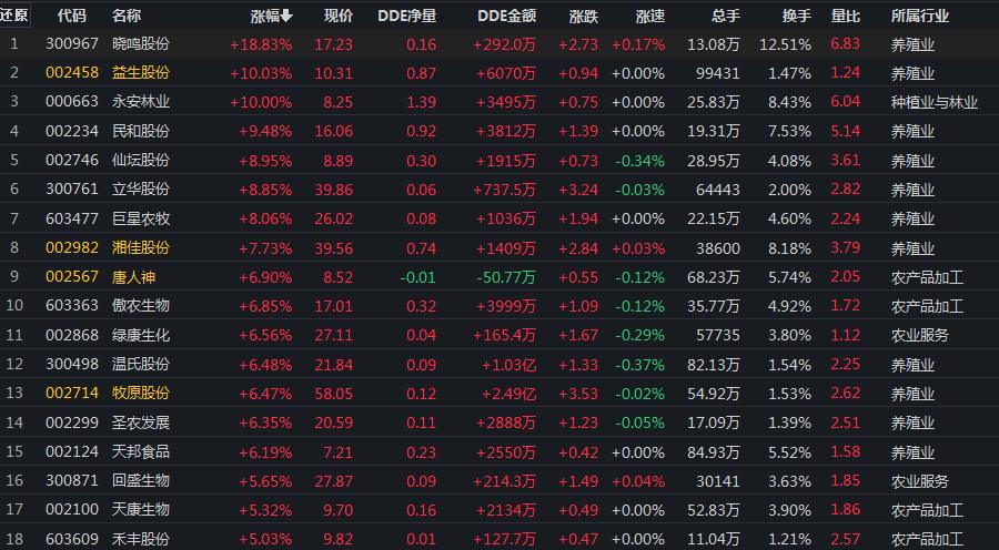 10月10日,農(nóng)林牧漁行業(yè)漲幅居首,達3.35%。其中,曉鳴股份漲幅居首達18.83%,益生股份和永安林業(yè)等2只農(nóng)業(yè)股聯(lián)袂漲停。