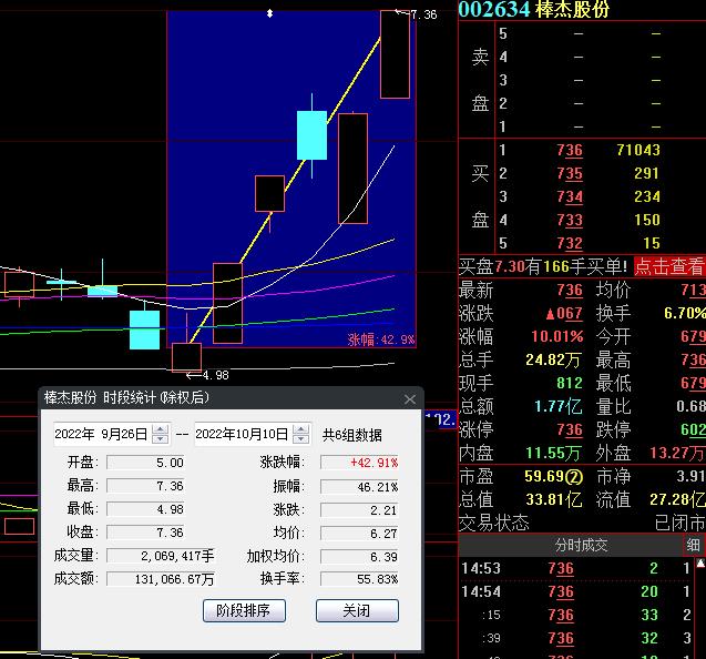 10月10日,熱門股棒杰股份再度漲停,截至收盤,報7.36元,實現(xiàn)6連漲,其中,有3個交易日漲停,6個交易日累計漲幅達42.91%。