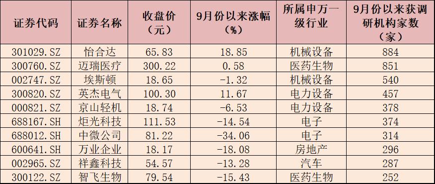 表:9月份以來獲調研機構家數(shù)居前10的公司一覽