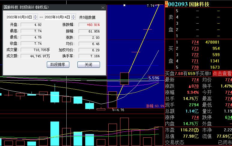 10月14日,熱門股國脈科技再度漲停,截至收盤,報(bào)7.74元,連續(xù)5個(gè)交易日漲停,累計(jì)漲幅達(dá)60.91%。