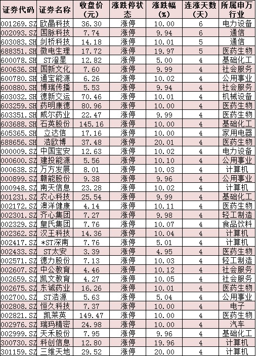 表:連續(xù)上漲4日且今日收盤漲停個(gè)股情況: